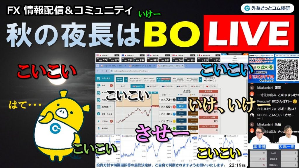 外為どっとコム総合研究所のTEAMハロンズ( https://twitter.com/TeamHallons )が平日毎日21時よりFXのライブ配信をしています。番組では、投資に役立つかもしれない注目材料の紹介、テクニカル分析などを行っているほか、実際にFX取引・バイナリオプションのリアルトレードも行っています。